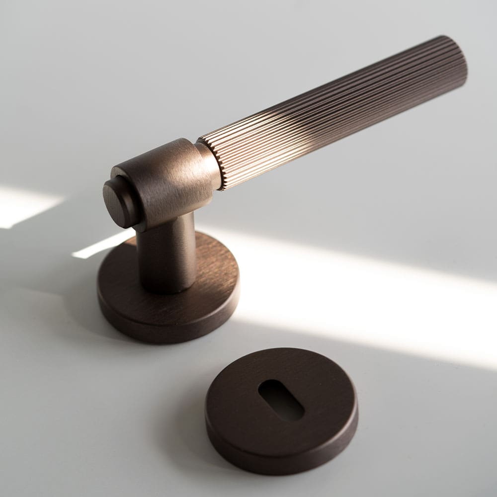 Dörrhandtag Helix 200 Stripe i mörk brons är ett vackert dörrtrycke för det moderna hemmet. Det räfflade greppet är snyggt, stramt och skönt att hålla i. Denna variant har också ett något tunnare skaft än Helix 200 i lättrat utseende. Nyckelskylt ingår i priset.