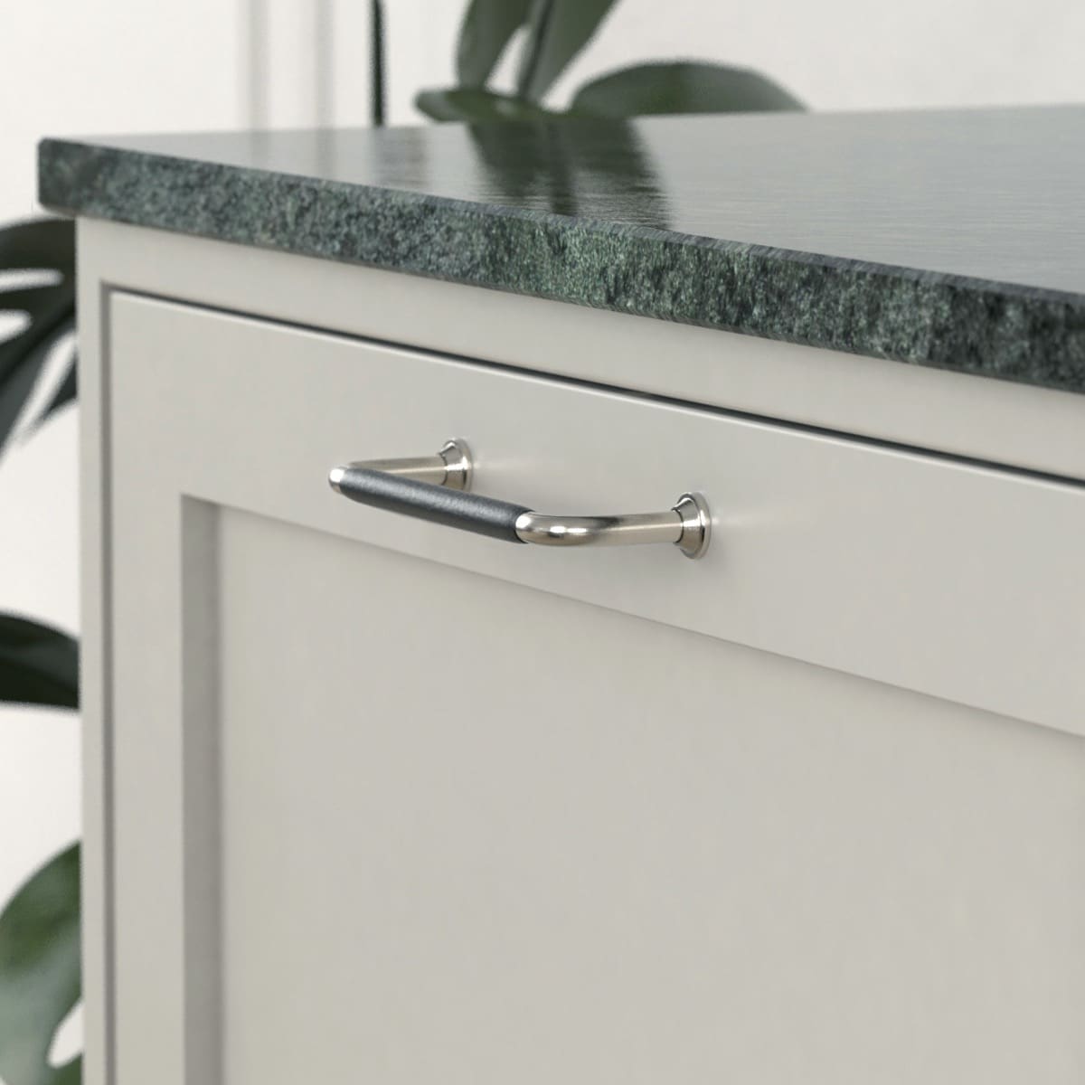 Handtag 1353 i den underbara kombinationen av det varmt blanka förnicklad som svepts med svart läder. Denna vackra modell finns i de tre mest sålda storlekarna 96 mm, 128 mm och helt nya 192 mm. Varför inte använda handtag 96 mm till kökslådorna i liggande placering, 128 mm till köksskåpen stående eller liggande och de nya större 192 mm till kylskåp och frys. Vad är skillnaden mellan lädersvept och läderlindat? Ska man vara hård så kan det lindade lädret föra tankarna till ett vackrare innebandy-klubba-grepp medan det svepta lädret är mer elegant och vackert. Den tidigare varianten i lindat läder har varit väldigt populär och intrycket vi fått av det nya handtaget med svept läder är att det borde kunna ge gamlingen rejält med konkurrens. Det här är nog vårt nummer 1 handtag just nu.