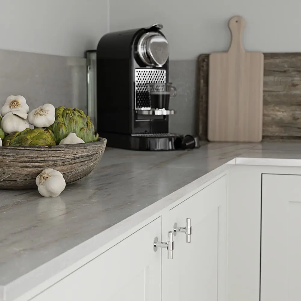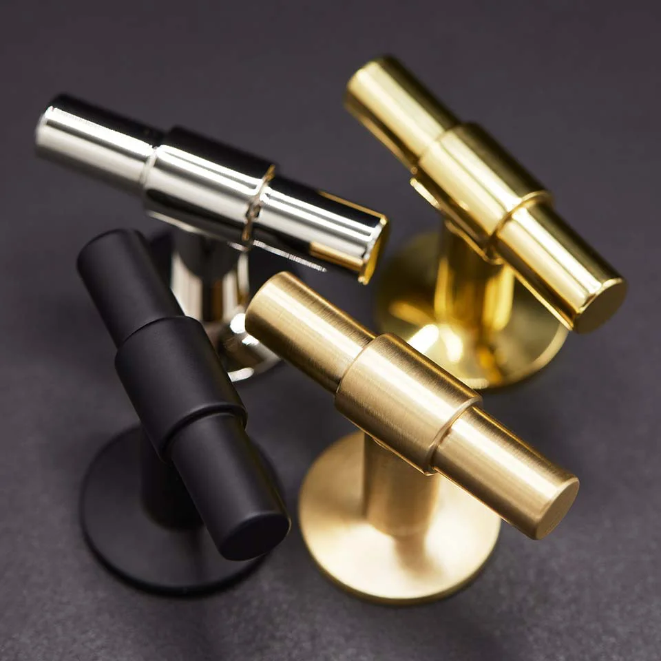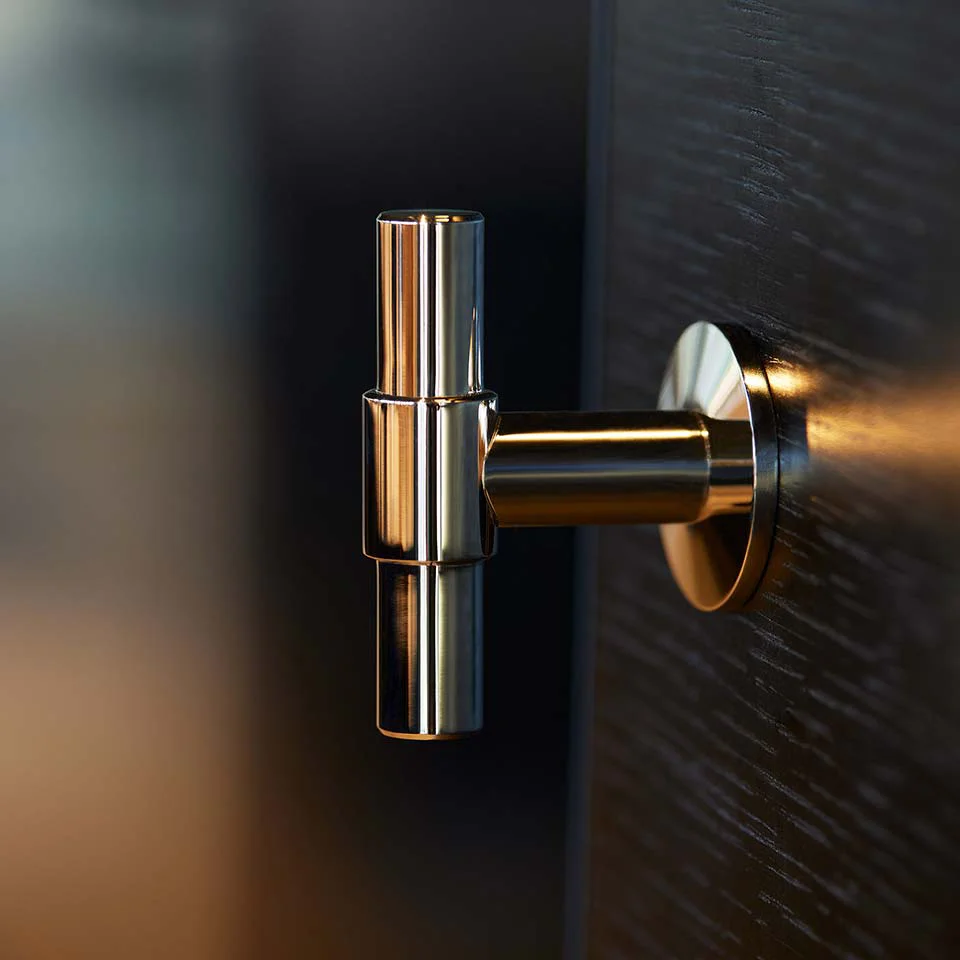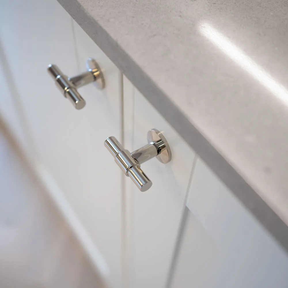 Knopp T Uniform i blank förnicklad med en bricka närmst skåpet. Denna underbart vackra skapelse från Beslag Design är tillverkad i massiv mässing som förnicklats. Detta ger knoppen tyngd och en lång livslängd. En modern klassiker som erbjuder ett skönt grepp och passar på såväl garderoben som i köket.